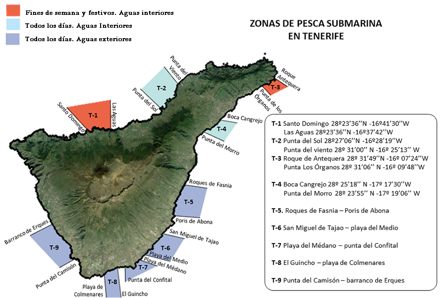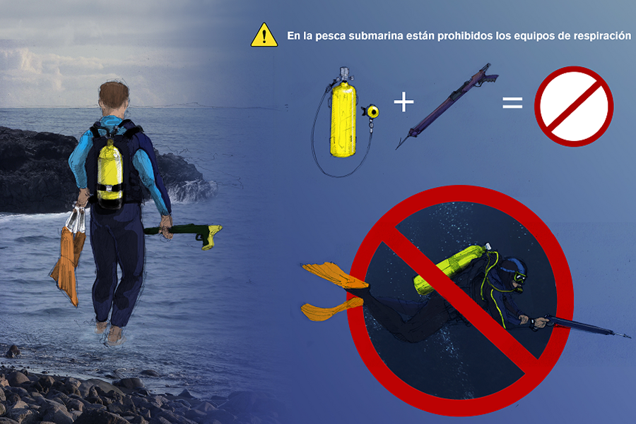 En la pesca submarina se debe mantener una distancia mínima de 150 metros de zonas de baño o zonas concurridas y de otros pescadores, a 926 metros de embarcaciones y a 70 metros de buzos y artes de pesca. Quedan prohibidas la pesca en puertos. Este tipo de pesca solo está permitido en las zonas indicadas en el mapa, tenga en cuenta que en las áreas en rojo solo se puede pescar fines de semana y festivo.