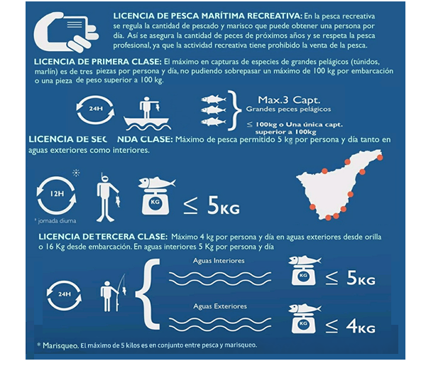 - Licencia de Segunda Clase: Máximo de pesca 5 Kg por persona y día en aguas exteriores e interiores.